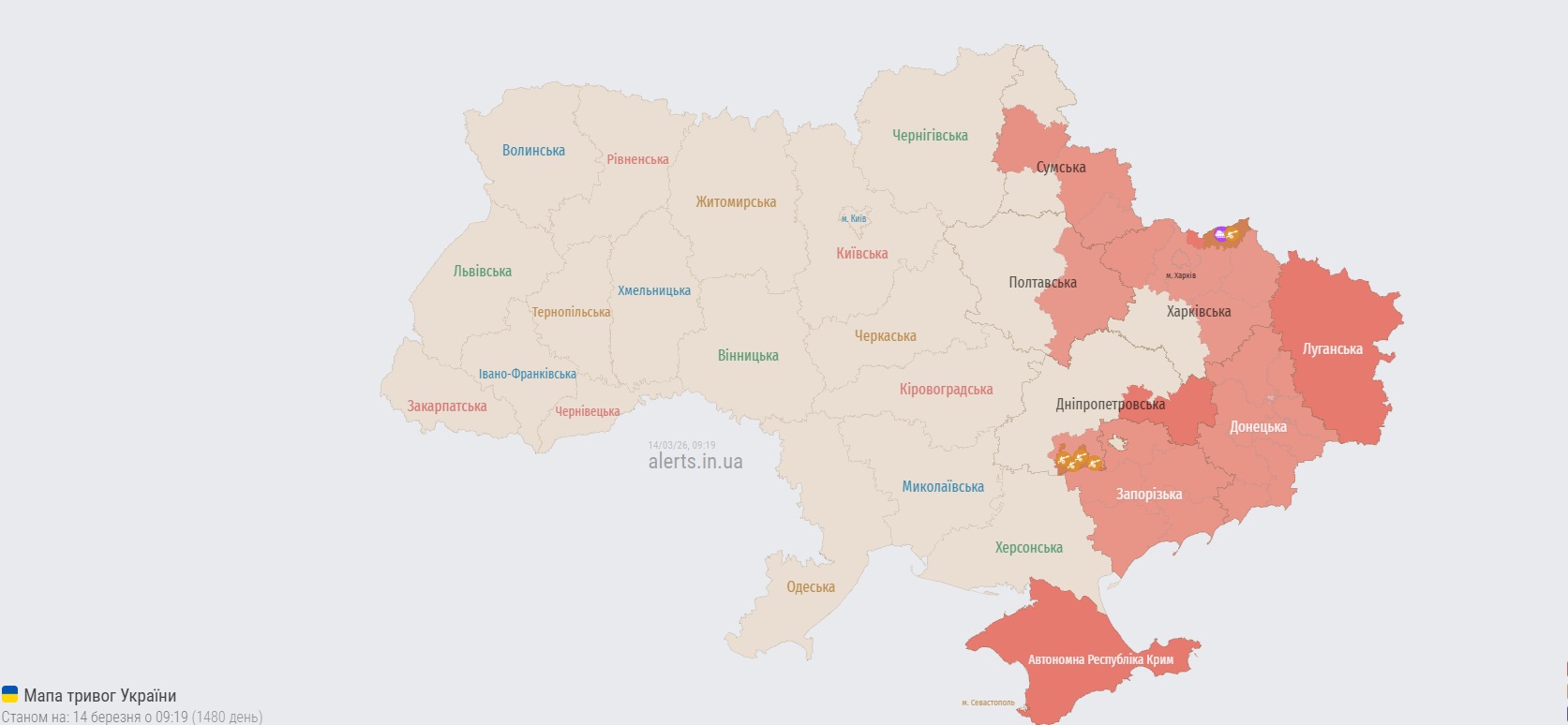 Російська армія в ніч з 13 на 14 березня рф атакувала Україну 498 засобами повітряного нападу - дронами, гіперзвуковими "Цирконами", балістичними і крилатими ракетами. Про це повідомило командування Повітряних сил ЗС України.