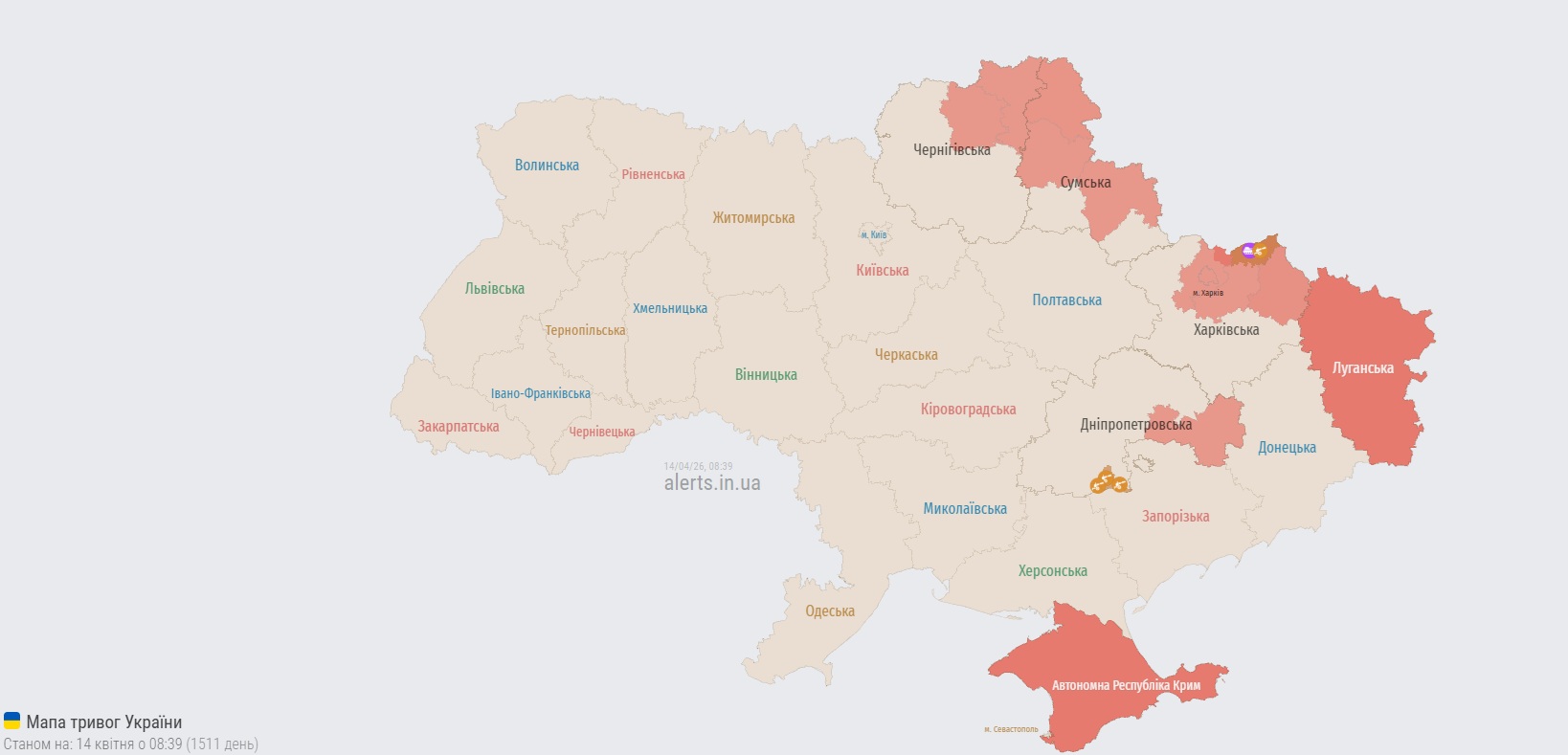 Станом на 8:40 "червоними" на мапі залишаються Крим, Луганщина, частково Донеччина, Чернігівщина, Сумщина, Харківщина і Дніпропетровщина.