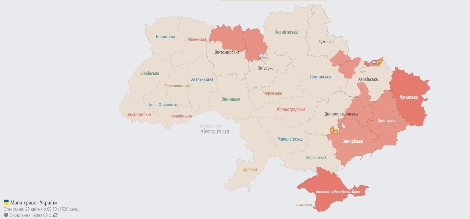 Станом на 8:13 "червоними" на карті залишаються Крим, Луганщина, Донеччина, Запоріжжя, частково Житомирщина, Київщина, Сумщина, Харківщина і Дніпропетровщина.
