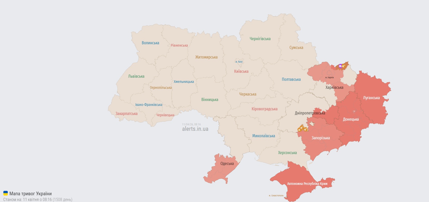 Станом на ранок 11 квітня "червоними" на мапі залишаються Донеччина, Луганщина, Крим, Запоріжжя, частково Харківщина, Дніпропетровщина і Одещина.