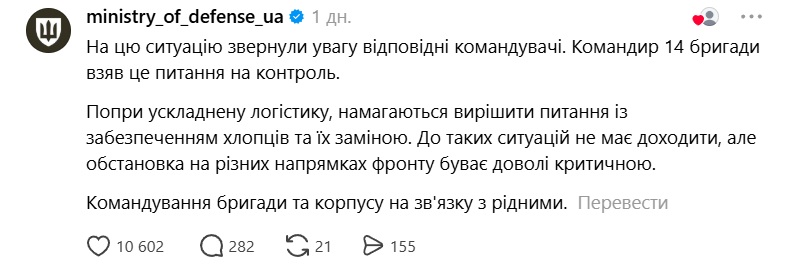 "На цю ситуацію звернули увагу відповідні командувачі. Командир 14 бригади взяв це питання на контроль. Попри ускладнену логістику, намагаються вирішити питання із забезпеченням хлопців та їх заміною. До таких ситуацій не має доходити, але обстановка на різних напрямках фронту буває доволі критичною. Командування бригади та корпусу на зв'язку з рідними".