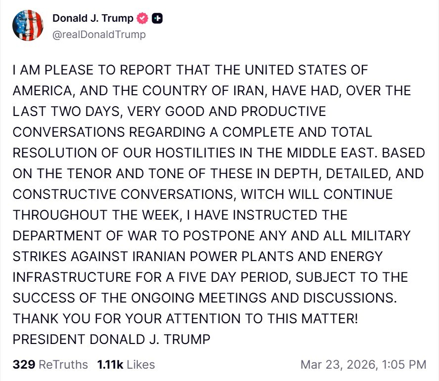 За його словами, після конструктивних розмов, які триватимуть протягом тижня, він доручив Міністерству війни відкласти будь-які військові удари по іранських електростанціях та енергетичній інфраструктурі на п'ять днів. Умою припинення ударів є успіх поточних зустрічей і обговорень.