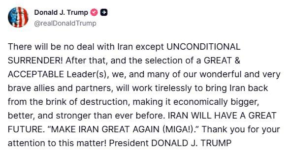 "З Іраном не буде жодної угоди, окрім БЕЗУМОВНОЇ КАПІТУЛЯЦІЇ! Після цього, та обрання ВЕЛИКОГО ТА ПРИЙНЯТНОГО Лідера (Лідерів), ми, і багато наших чудових і дуже сміливих союзників і партнерів, будемо невпинно працювати, щоб повернути Іран з межі знищення, зробивши його економічно більшим, кращим і сильнішим, ніж будь-коли раніше. ІРАН МАТИМЕ ВЕЛИКЕ МАЙБУТНЄ. «ЗРОБІТЬ ІРАН ЗНОВУ ВЕЛИКИМ (MIGA)!» Дякую за вашу увагу до цього питання! Президент ДОНАЛЬД ДЖ. ТРАМП", - написав він у Truth Social.
