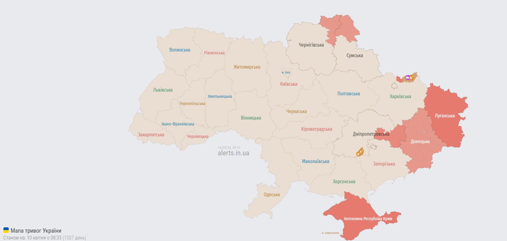 На 8:30 "червоними" на карті є Донеччина, Луганщина, частково Дніпропетровщина, Сумщина і Чернігівщина.