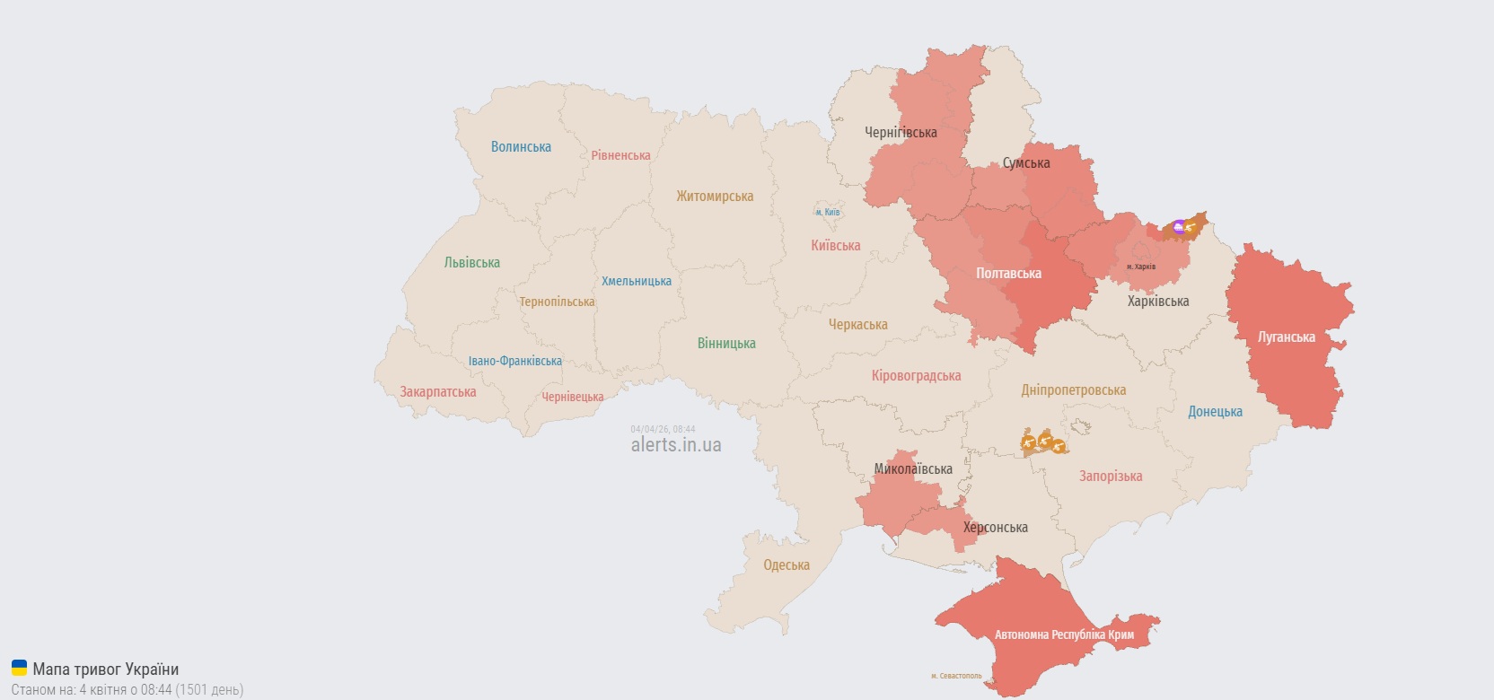 Станом на 8:44 "червоними" на карті є Донеччина, Луганщина, Крим, Полтавщина, частково Сумщина, Миколаївщина, Херсонщина, Харківщина і Чернігівщина.