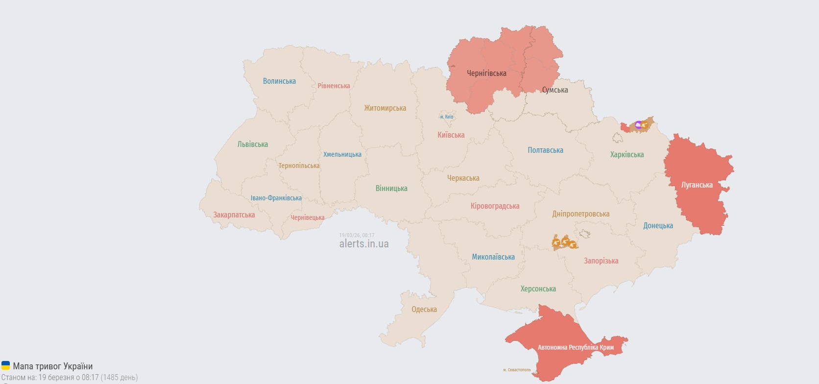 Станом на 8:17 "червоними" на мапі залишаються Чернігівська і частково Сумська області.