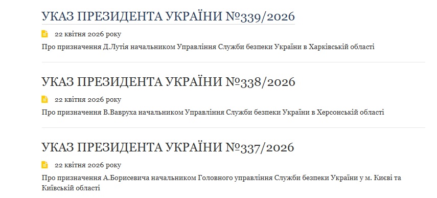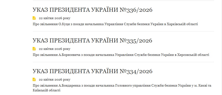 Президент Володимир Зеленський провів кадрові зміни в Службі безпеки України. Він звільнив керівників у Києві та Київській області, а також на Херсонщині і Харківщині та призначив нових. Відповідні укази опубліковані на сайті глави держави.